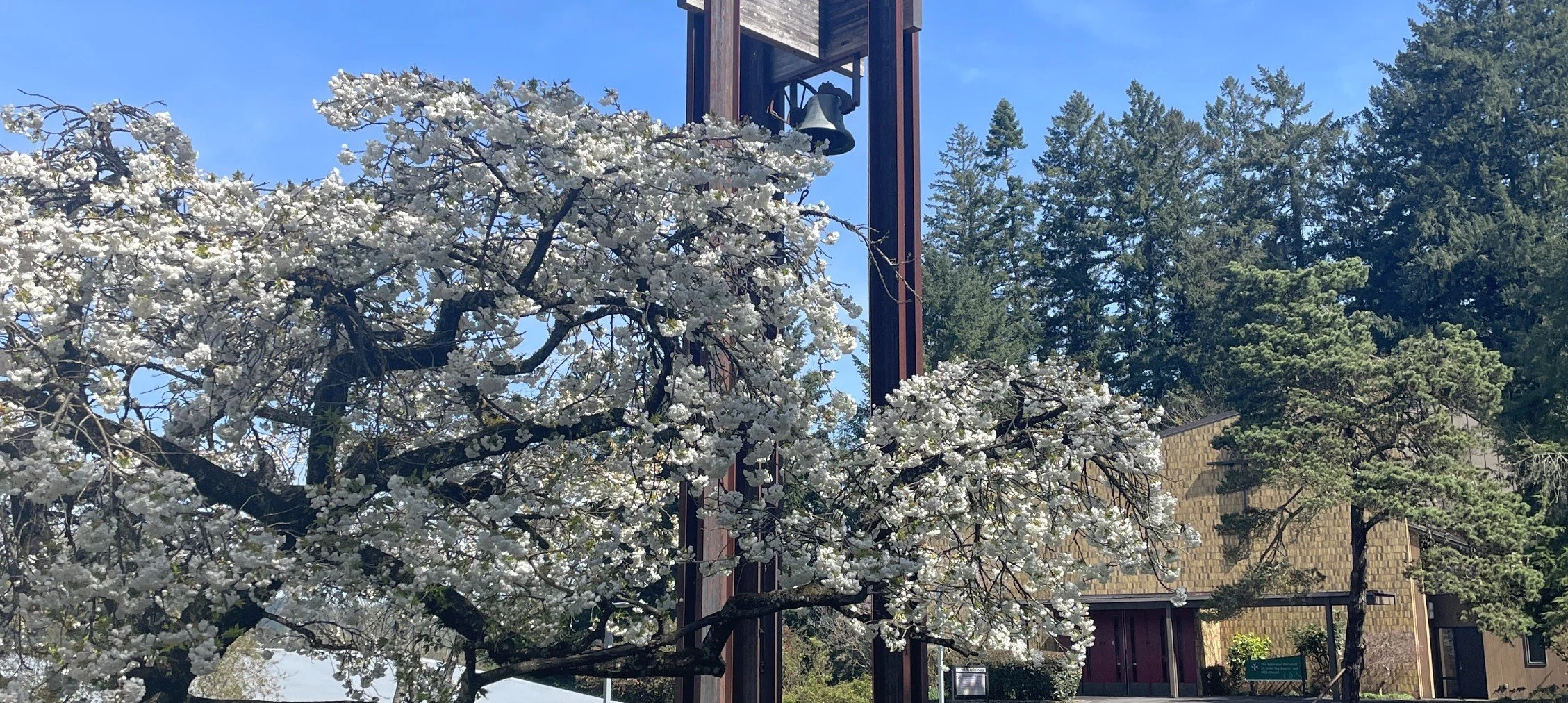 As you arrive, you’ll be on the peaceful campus of the Oregon Episcopal School. We’re the modern building with the big cross just beyond the belltower. There’s lots of parking!